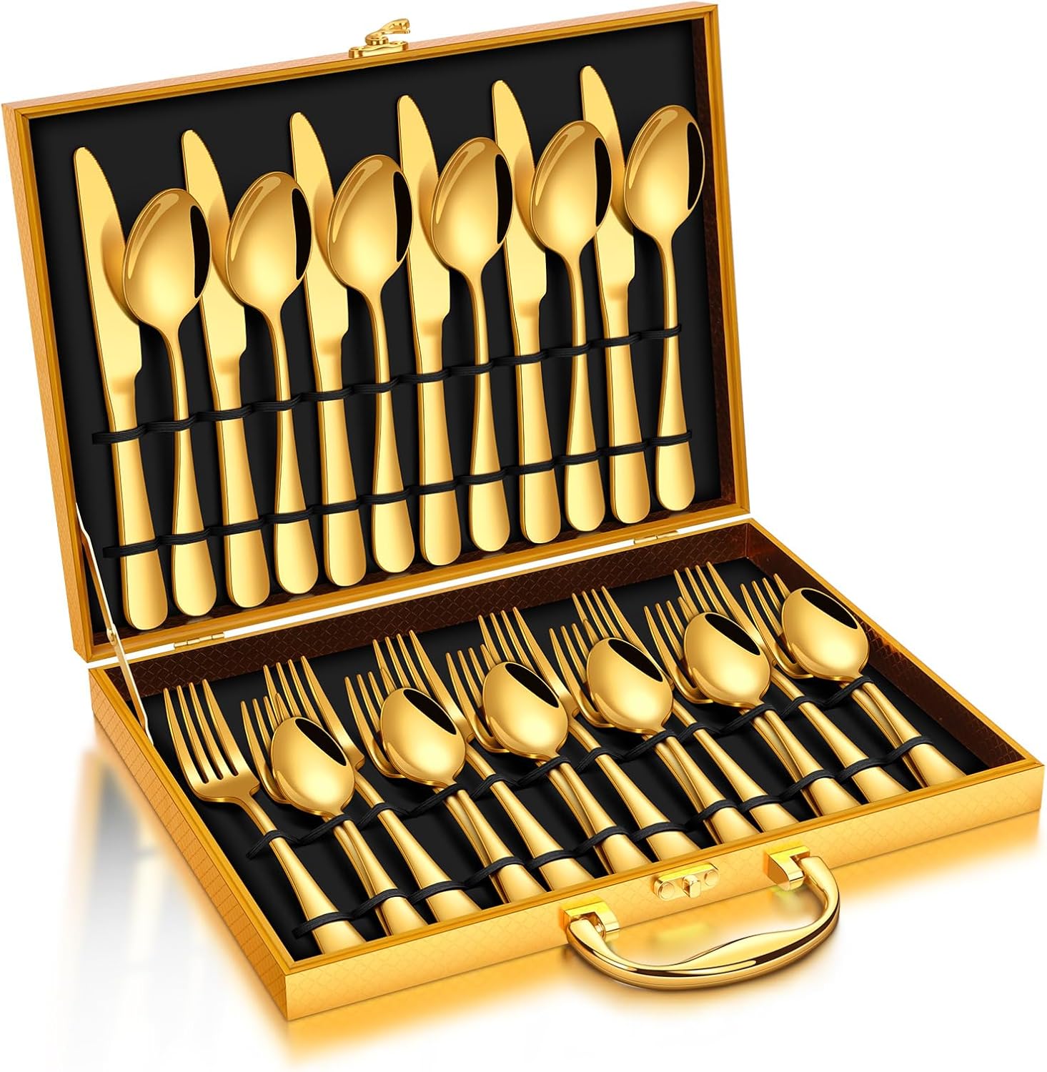 - GORGEOUS AND ELEGANT DESIGN: The gold stainless steel silverware features a classic silhouette with clean lines, and the bright golden appearance highlights the festive atmosphere and creates an elegant, noble, and luxurious dining environment. It comes in gift-grade packaging that is not only perfect for family meals at home but also ideal for entertaining guests