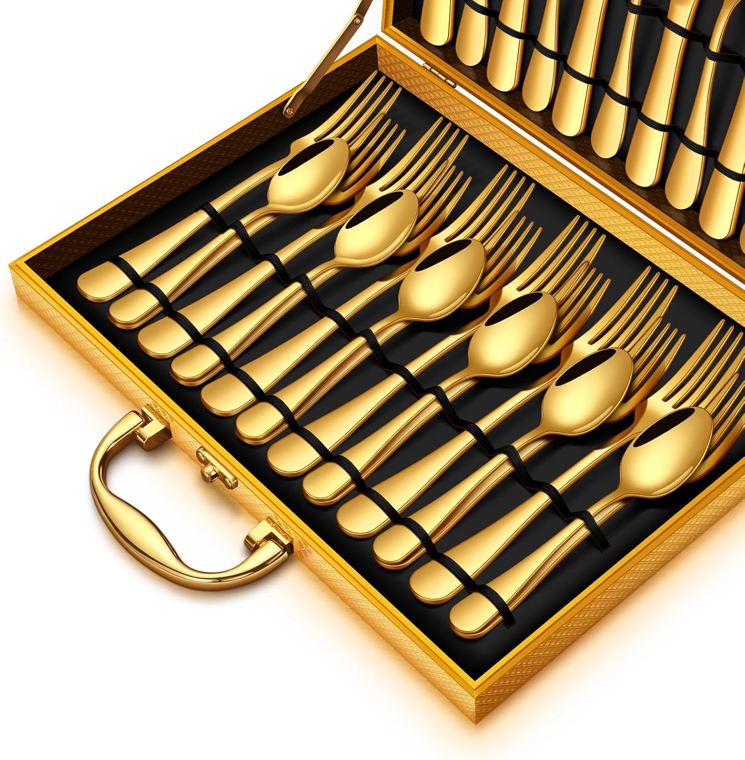 - 30 PCS GOLD SILVERWARE SET: Includes 6 dinner knives, 6 dinner forks, 6 dinner spoons, 6 salad forks, and 6 teaspoons, in addition to a sophisticated handled gift box/storage case. Adding this silverware set makes your dinner more elaborate and designed. It can also used as a table setting for family gatherings, parties, candlelight dinners, festival celebrations, housewarmings, weddings, picnics, boudoir tea parties, etc
