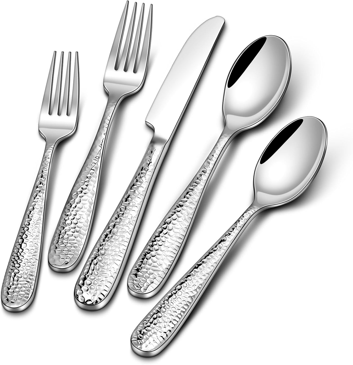 - TIMELESS TABLEWARE: This stunning set includes 4 dinner knives, 4 dinner forks, 4 dinner spoons, 4 salad forks, and 4 teaspoons. It’s beautifully hammered with a smooth mirror finish to create an elegant and striking appearance, perfect for any occasion